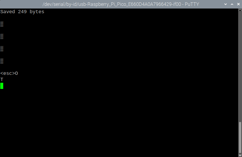 not quite - GFXterm has been built to work with the micromite editor and is available for linux, windows, and RPi. try running the following program on your pico: Do I=Timer Do a$=Inkey$ Loop Until a$<>"" If Timer-I>100 Then Print If a$=Chr$(13) Then Print "<cr>"; ElseIf a$=Chr$(10) Then Print "<lf>"; ElseIf a$=Chr$(27) Then Print "<esc>"; ElseIf a$<Chr$(32) Then Print "<";Hex$(Asc(a$),2);">"; Else Print a$; EndIf Loop (from: https://www.thebackshed.com/forum/ViewTopic.php?TID=12138&P=1#146653 ) press each of the problematic keys and the above program will print out what escape sequences are being sent by PuTTY. report back the results. cheers, rob :-) Edited 2022-10-22 11:31 by robert.rozee |