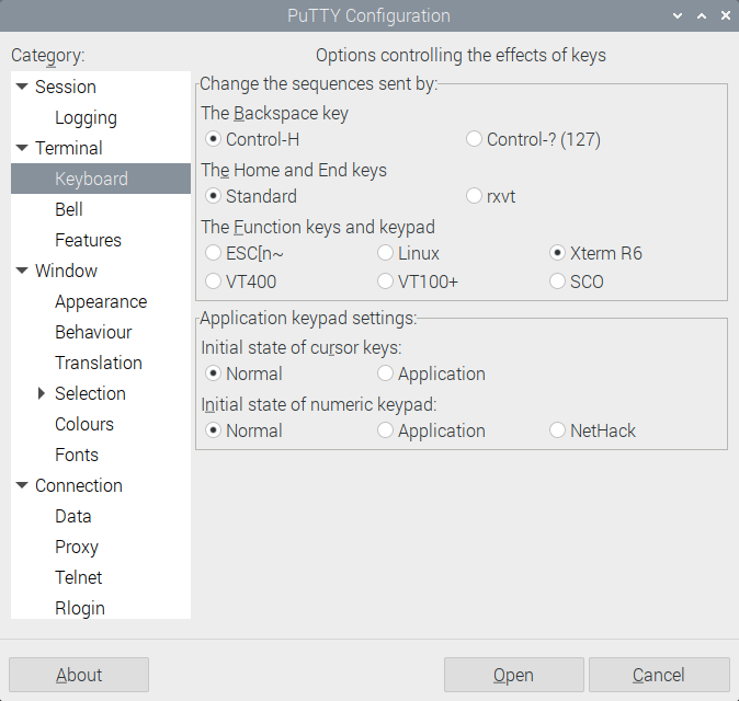 Hi again all; You guys have been more than helpful. Robert talked about GFXterm so I looked at the putty settings and there is a Function Keys and Pad setting option to Xterm R6 so I changed it to that from VT100+. The F5 works properly as far as the quick test that I tried. ![]() I should have remembered that the terminal you emulate makes the behavior different. Again thanks for all the great advice. This forum rocks. ![]() Much happier hobbyist, Hans ... ![]() PS: Added note, I tried my keyboard test and all keys return values as expected now. Hans ... ![]() Edited 2022-10-23 02:07 by Hans |