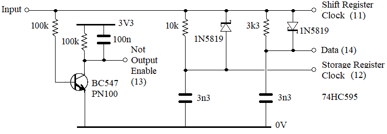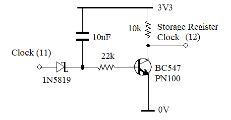 Latch Pin 12 3n3 to gnd, 10k to CK, diode anode, cathode to CK  - Pin 11