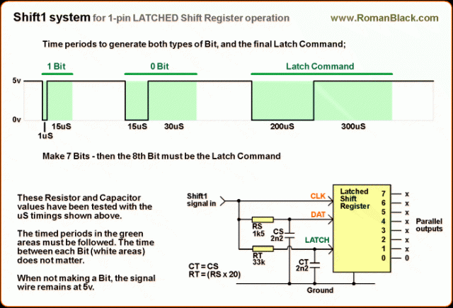 ' 2uS to 5uS low = 1, >22uS low = 0 and >50uS high = latch clock