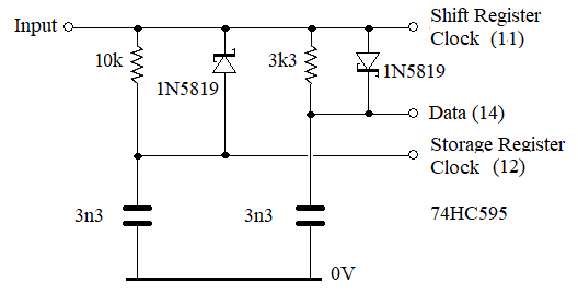 Data Pin 14 - 3n3 to gnd, 3k3 to CK, diode cathode, anode to CK - Pin 11