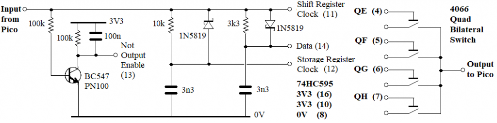 In this example the 74HC595's 4 low outputs expand one Pico output and the upper 4 outputs drive a CD4066 quad analogue switch IC to expand one analogue input.