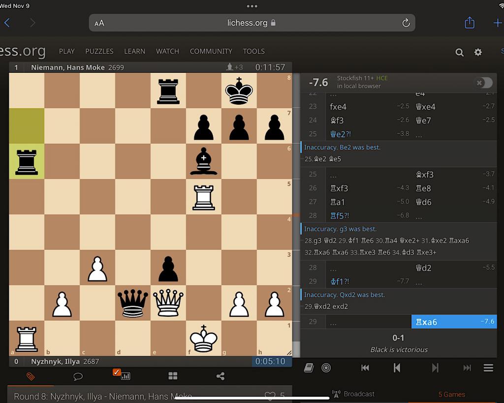 You know, I thought I might see about including an MP3 file with Hans Niemann saying “My chess speaks for itself.” as an introduction to the program.  Hans Niemann won his game today against Nyzhnyk, increasing his rating to 2700.