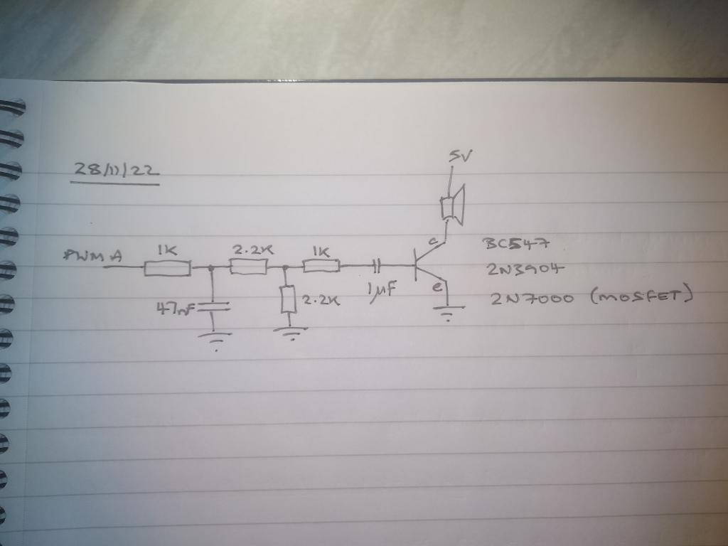 phil99 said  The average voltage on the Pico pin should be about 1.65V and the frequency 44.1kHz even with no modulation. If you can get that measure V and f on the base and collector. I would expect the average readings to be 0.3V B-E and 2.5V C-E with  44.1kHz on both.