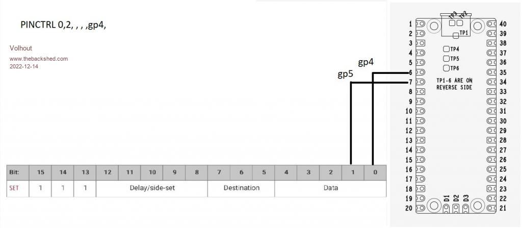 You were testing us to make sure we were paying attention! 'disconnect ARM from GP2 SetPin GP2,pio1 'configure pio1 p=Pio(pinctrl 0,1,,,,GP2,) f=2000 'Hz 'pio program 'line code comment ' 0 E081 GP2 output ' 1 E001 pin high ' 2 E000 pin low ' 3 0001 jmp 1 'program pio1 'PIO PROGRAM LINE pio, line,instruction PIO program line 1,0,&hE081 PIO program line 1,1,&hE001 PIO program line 1,2,&hE000 PIO program line 1,3,&h0001 'write the configuration: PIO, state machine, frequency,pincontrol,,,start address PIO init machine 1,0,f,p,,,0 'start the pio1 code PIO start 1,0 SetPin GP6,fin Pause 1000 Print Pin(gp6);" Hz from PIO1" Pause 5000 PIO stop 1,0 > option cpuspeed 126000 > RUN Produces the tone. PS The subject of Chapter Ten got my attention. Have been playing with 74HC595s, driving with just 1 Pico pin Edited 2022-12-12 14:51 by phil99 |