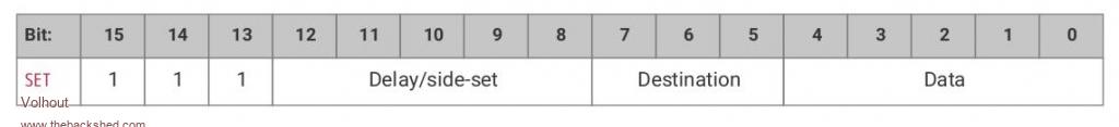 The RP2040 is a microcontroller around a dual ARM M0 core. The ARM cores can communicate with the outside world using peripherals. Many of these peripherals are common function blocks, such as TIMERS, I2C, SPI ADC's and individual Inputs and Outputs. The TIMERS are often used for PWM. MMBasic has it's dedicated way of dealing with the peripherals. Input and Output and PWM, I2C, SPI and ADC are well supported from the language. The RP2040 however has one peripheral that is not a common function block: the PIO. The PIO is something that the Raspberry Pi designers added to make the chip very versatile, since it can be freely configured. The PIO can manipulate IO pins of the RP2040 chip without any intervention of the ARM cores Each PIO has 4 state machines that can run simple programs to manipulate IO pins. Stating that: it can run programs. But not like a microprocessor. It has a very limitted instructions set, it cannot even increment a value or add 2 numbers. When the ARM (MMBasic) assigns a pin to the PIO, it looses direct control over that pin. The ARM has only limitted control over what the PIO does. The main interface between the PIO and the ARM are the FIFO's. And it can start/stop execution of each statemachine in the PIO (there is more, but that will come in a later chapter). Block diagram of a PIO: the 4 state machines and the FIFO's are shown. As is the access to the IO. ![]() There is much documentation in the RP2040 datasheet (whole of chapter 3) on the PIO, that I often consult. You can find the datasheet on the Raspberry Pi web page. The RP2040 has 2 PIO blocks (so in total 8 state machines) but we will only experiment with PIO block 1, since PIO block 0 is used for generating VGA video in the VGA picomite ("boot to basic computer" on Geoff's website). And the VGA picomite is a perfect platform to learn through execersize. One thing the PIO has in common with MMbasic is that you need to provide 2 things: 1/ The configuration (in normal MMbasic this is the OPTION list, and the SETPIN commands) The PIO configuration from MMBasic uses the PIO INIT MACHINE command where it provides each state machine with the IO map and execution speed and other parameters (details later) MMBasic provides helper functions for the configuration. Many configuration parameters are defaulted in MMBasic, and we will use that. 2/ The program (in normal MMbasic this the the basic program, and occasionally the CSUB's). Writing a program into the PIO uses the PIO PROGRAM command. MMBasic does not directly support Mnemonics (text describing the instruction) so we will manually create the hex codes that the PIO will execute. Running the PIO program with PIO START, and stopping it with PIO STOP Above these commands can be executed inside the MMBasic program, so MMBAsic keeps control over the PIO's. Before we can configure a PIO state machine we need to know a bit about it's capabilities. We'll start with the simple things, and will dive deeper each post. IO The state machines can SET a pin high and low. They can shift serial data OUT and IN. The capaitals show the actual command... SET, OUT, IN. So IN does not read the state of a pin, it shifts a data bit IN. The shift in and shift out can shift multiple bits to equal number of SUCCESSIVE pins. A 32 bit FIFO value can be shifted out to 32 pins, making it a 32 bit write to IO. Finally the state machine can read the status of a pin (but there is not direct command for it). In the configuration you assign a number of pins to the state machine. As mentioned above, the state machine groups pins, so successive pins should be considered (i.e. SET output pins are GP1,GP2,GP3). There are configuration fields for IN, OUT, and SET (and SIDE SET, later more about this). You can assign the same pin for multiple functions (i.e. GP0 is used for OUT and SET, which is handy if you want to build a UART in PIO). The program for the complete PIO The statemachines execute 16 bit code. A PIO has 32 words (16 bit) of program memory. That program memory can be used for 1 state machine, but also for 2,3 or 4 state machines. They share program memory. One beautifull thing is that all 4 state machines can run the same program AT THE SAME TIME. In case you write a SPI output program, you essentially have 4 completely independent SPI outputs if you want. The state machines each have their own execution speed. Let's do out first program, start simple... blink (fast) Our first program is a LED blink program. The LED will blink very fast to keep things simple (666Hz) and in a later thread we will slow it down. We want the LED to connect to GP0. First we have to attach the GP0 pin to the PIO (PIO1 in this case). code SETPIN GP0,PIO1 Now the PIO must take control of the GP0 pin We want to be able to SET the GP0 pin high and SET the GP0 pin low to blink the LED. That is done in the pincontrol of PIO INIT MACHINE. There is a helper function for pincontrol: PINCTRL that has successive fields for : a/ the number of SIDE SET pins (not used here, but needs to be filled in, use 0) b/ the number of SET pins (we used 1 pin, GP0, so this must be a 1) c/ the number of OUT pins (not used here) d/ the lowest pin for IN pins (not usede here) e/ the lowest pin for SIDE SET (not used here) f/ the lowest pin for SET (must be set to GP0) g/ the lowest pin for OUT (not used here) so PINCTRL (0,1,,,,gp0,) This tells the state machine there is 1 SET pin it can use, and the SET pin is GP0. If you change the "1" to a "2" the state machine can use GP0 and GP1 (2 succesive pins). Now we can start writing the PIO state machine program We want to do following SET PIN to output label: SET PIN HIGH SET PIN LOW GOTO LABEL The state machines have a SET instruction: ![]() The instruction can SET up to 5 bits (the DATA field) in multiple destinations (DESTINATION field). One of them being the IO pins (DESTINATION = 000). The DELAY/SIDE SET field will be ignored for now (value 00000). More information about the SET instruct