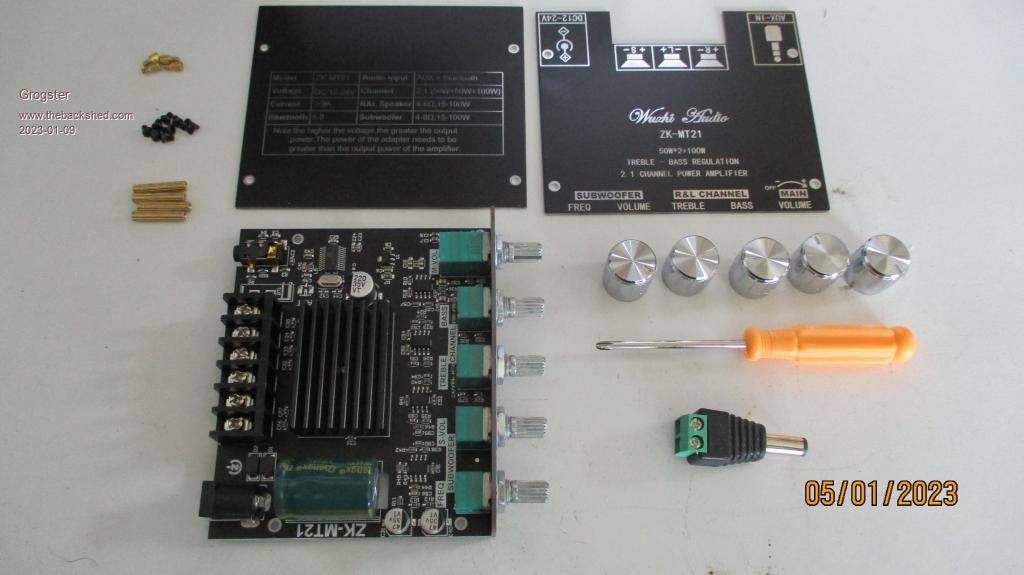 Comes as a sort-of knock-down kit, requiring some simple assembly, but you get all the bits including the knobs and even a DC-to-terminal adaptor thing for power supply and even a cheap screwdriver!  All this comes packed inside a nice cardboard box.