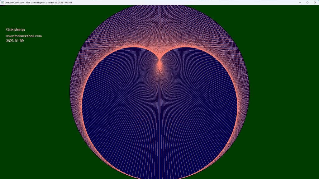 This video is not new and I was reminded of it when I saw a short Basic program on FaceBook to reproduce the graphics/animations. Of course I had to convert it to MMBasic. My CMM2 has issues so I have used MMB4W, but it should work on all versions with minor changes. Adjustable parameters are explained in REMs. Animation will pause while any key is pressed.