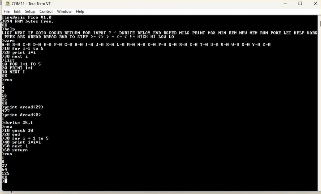 This is really cool. Before I know that something more powerful like MMBASIC exists, I used exact this TinyBasic for Arduino stuff and modified it with my own statements and functions. Making it available for the Pico is cool too! I will definitly give it a try, especially for really simple stuff!