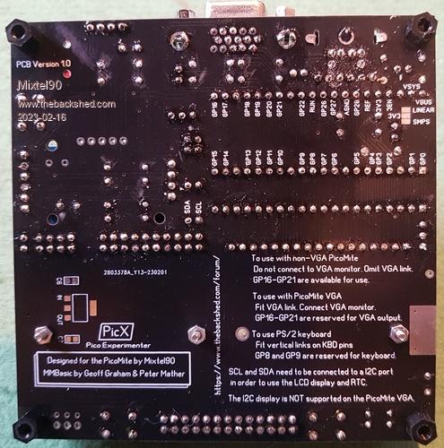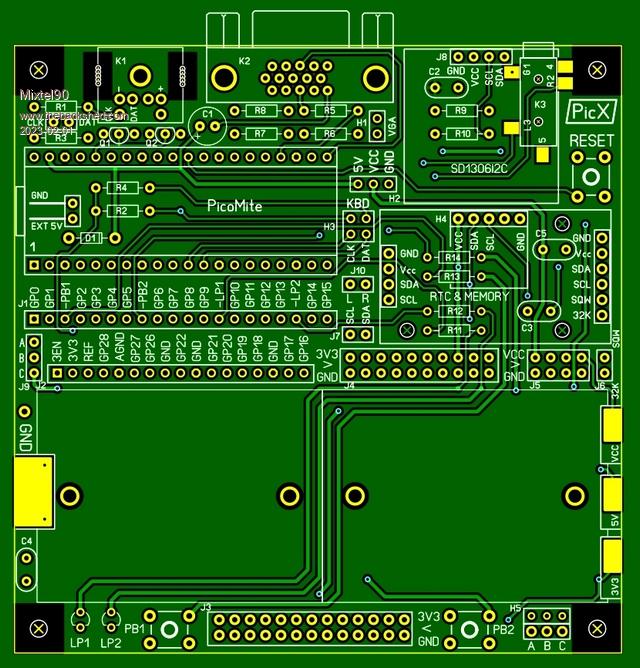 Not on this one, John. I did a board aimed at educational use not long ago (PicoMite XPerimenter). That takes "hats" that are intended for isolators, resistor/diode networks etc. exactly for this purpose. It can also be built as either a VGA or a non-VGA "Control" type, and can also be a backpack for an ILI9341 display. You can get two out f a 100x100 PCB. The "hats" can be made from any 0.1" matrix board if you don't want to sort out PCBs. Details & construction pack in my sig. PicX is intended for those who need raw access to the pins. Adding isolation, ADCs etc would only get in the way (and I've run out of PCB area anyway. lol). The idea is to have a basic system of Pico, usable breadboard area and RTC (to keep times & dates on development files) all in one place to make things easy. Everything essential except for the PS/2 level shifting mosfets will unplug. (I tried socketing the mosfets but there isn't enough space). The Pico should be treated as CMOS logic. It has low drive capability. It may not be incredibly robust, but it's cheap - much cheaper than the PIC32 range. :) Having said that, they do seem to be able to take a moderate amount of abuse. Mick Zilog Inside! nascom.info for Nascom & Gemini Preliminary MMBasic docs & my PCB designs |