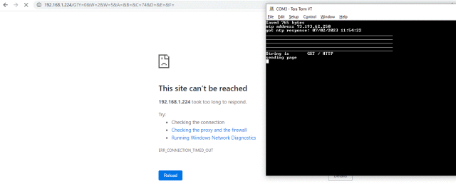 There's never a response from the server, and MMBasic is locked up--I have to power cycle to get the ">" prompt. (In fact, the server is locked up immediately after it prints "sending page".)