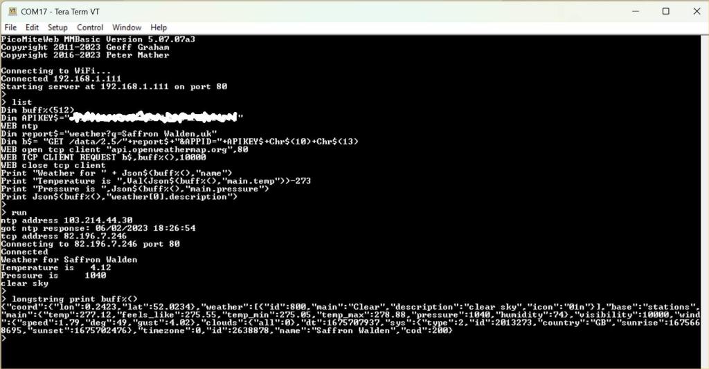 This variant has all of the functionality of the standard PicoMite with the exception of the GUI commands and function. These have made way for the WEB command that allows wireless access to the internet and the json function has also been added to allow you to parse the data from things like openweathermap.org.