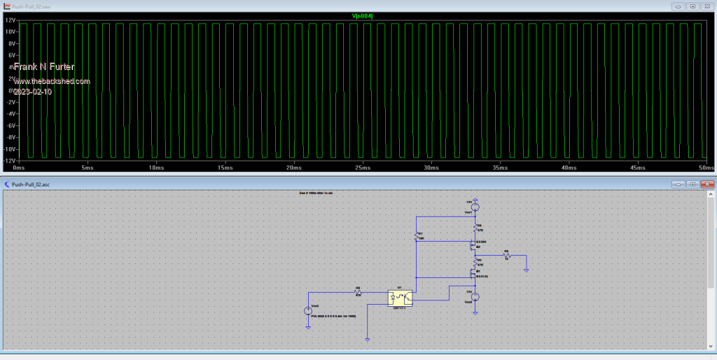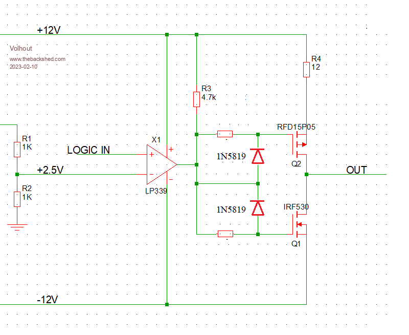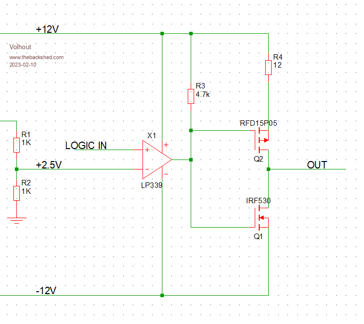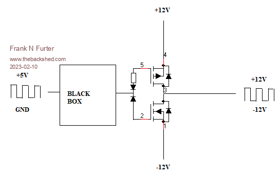 I have a +5V/GND square wave voltage which I want to convert to a +/-12V square wave voltage using two mosfets.