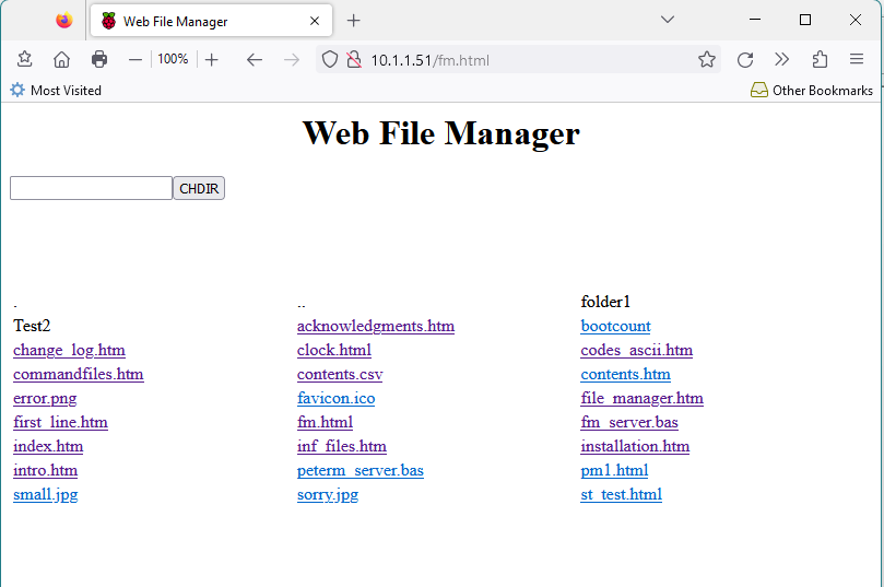 </body> </html> Add this to the declarations: Dim sdir$="" ' subdir Add this to the top of gotrequest (just the "NEW" stuff - indented code shown for reference) Local arg$(1,maxargs-1) sdir$="" ' NEW For a%=1 To MM.Info(max connections) and here's the updated makelist: Sub makelist Local f$, n, k For n = 1 To 72 filename$(n) = "" ' clear old entries Next n = 0 f$ = Dir$(sdir$+"*",DIR) If sdir$ <> "" Then Inc n: filename$(n) = ".. ' : Print /+sdir$ Do While f$ <] If Right$(f$,1) <]"." Then ' skip the ./.. Inc n filename$(n) ="<a href='fm.piml?dir="+f$+"'>"+f$+"/" 'Print "_"+f$ EndIf f$ = Dir$() Loop Inc n filename$(n)=" " f$ = Dir$(sdir$+"*",FILE) Do While f$ <> "" Inc n filename$(n) ="<a href="+Chr$(34)+f$+Chr$(34)+">"+f$+"" 'Print "-"+ f$ f$ = Dir$() Loop End Sub Oops, missed the argument bit ' process arguments before returning page with updated results If page$ = "fm.piml" Or page$ = "fm" Then For i=0 To nparams% If arg$(1,i) <> "" Then Print arg$(0,i);"=";arg$(1,i) If arg$(0,i) = "dir" Then sdir$=arg$(1,i)+"/" ' NEW Next i makelist Edited 2023-02-17 12:36 by TheMonkeys |