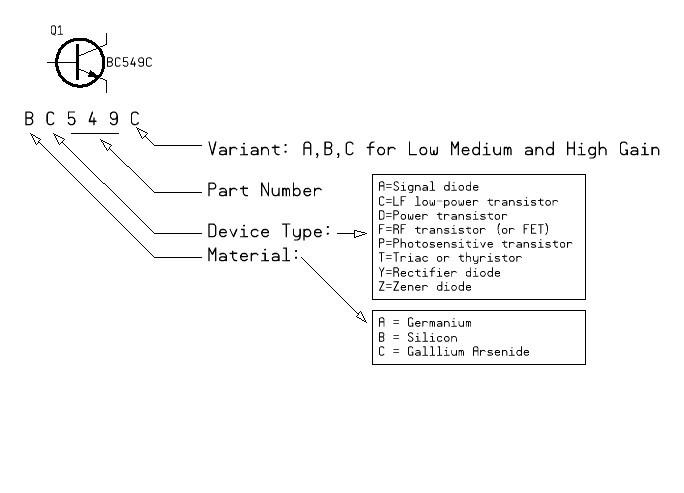 Europe adopted a standard for semiconductor parts naming that was based on a pre-existing Philips standard used for vacuum tubes. These parts became known as the Pro Electron/EECAdesignation which was created in the mid 1960s. It used a much more informative prefix and suffix than the JEDEC standard used (JEDEC is where 1N for diodes and 2N for BJTs came from). Here is an example: