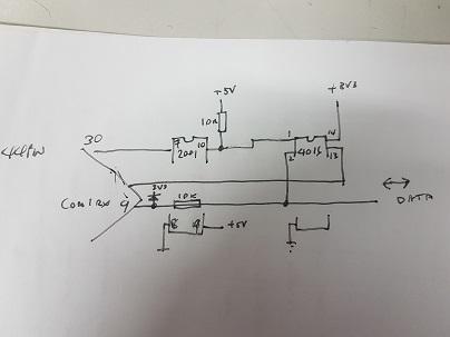 Serial data coming in is read on Com1 RX and serial data out is bit banged out of pin 30, inverted and increased to 5V pp and let thru to the data line via the 4016.