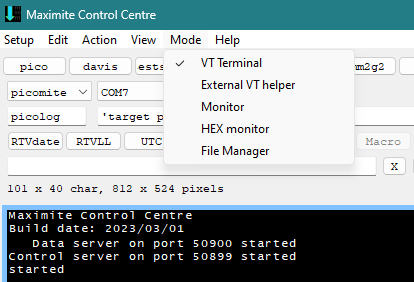 External VT helper assumes the an external terminal program such as TeraTerm is connected to the data port. All data is transferred between the attached device and the terminal program. Additionally, you can send macros and other commands etc from the Control centre without interrupting the terminal session.