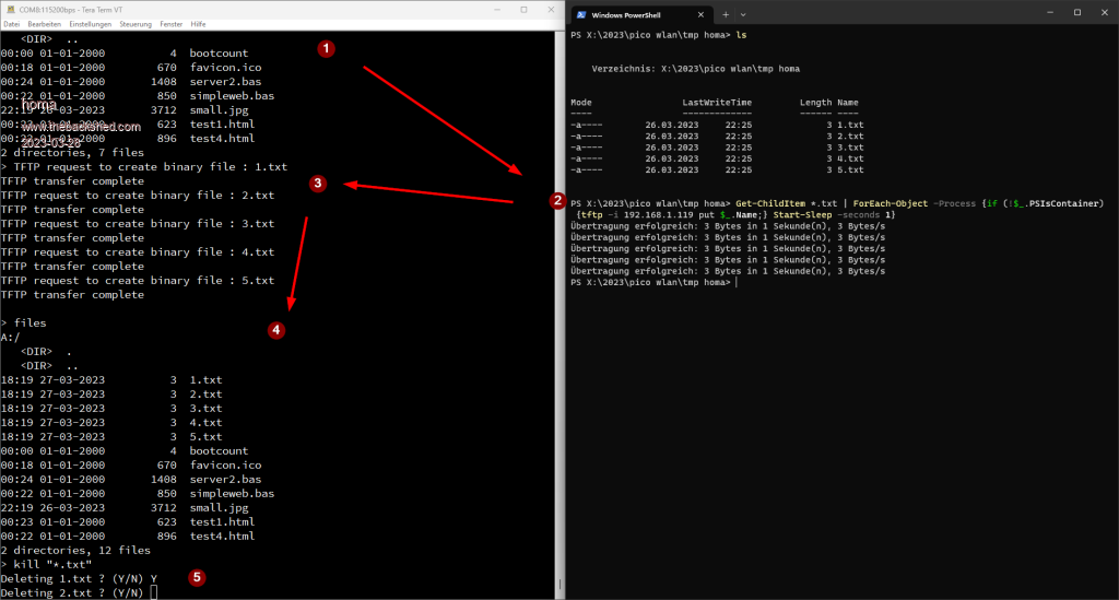 The parameter -i is important (otherwise e.g. no images will work). With this command e.g. only .TXT or .HTML or also all (*.*) files from the current directory can be transferred to the PicoMite in one go! The pause is important so that the PicoMite can keep up with the requests.