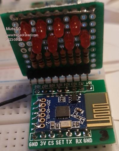 I just fed the 8 GPIO pins of a JDY-40 to 8 GP pins of a RP2040-Zero and set the system up so that the PicoMite counts up on the PORT. The JDY-40 sends the data to another one connected to LEDs. With the transmit power set as low as it will go and the baud rate set to 19200 (the maximum) it's just losing signal with the transmitter at the front of the house and the receiver at the bottom of the back yard if I put it close to the wall. Easily enough power to cover a room or two in many cases. I'll re-test the range with text data later.