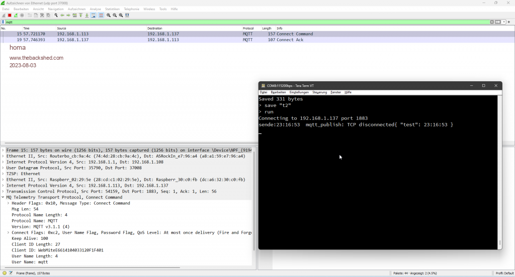 Unfortunately I don't see this in Wireshark! My little test programme: WEB mqtt close WEB mqtt connect "192.168.1.137", 1883, "mqtt", "*******" SetTick 60000,mymqtt Dim test$ ' Do Loop ' Sub mymqtt test$=Time$ Print "sende:";test$, value$="{ "+Chr$(34)+"test"+Chr$(34)+": "+test$+" }" WEB mqtt publish "homa-test",value$ Print value$ End Sub At 60 seconds, everything looks good ... ![]() I don't see a keep-alive signal after 180 seconds ... Instead, the system tells me that the connection has been closed. ![]() Edited 2023-08-03 07:41 by homa |