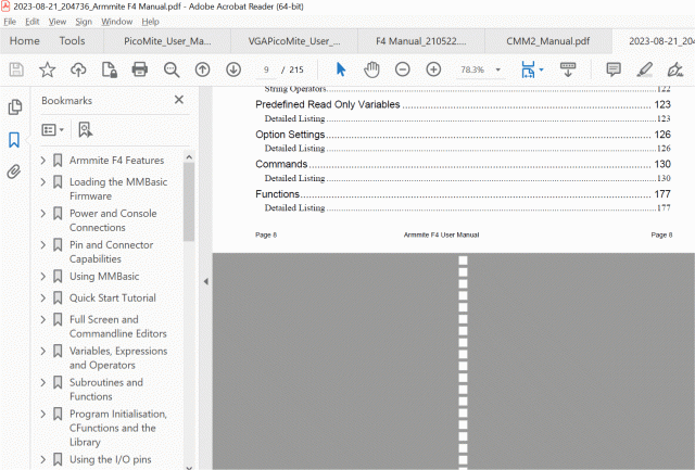 The Armmite F4 manual has been updated with details of all enhancements and contains some other improvement/corrections.(see change log section in the manual for list of changes.) The footer of each page has the page number on both the left and right margins so one will survive if the manual is printed and bound.