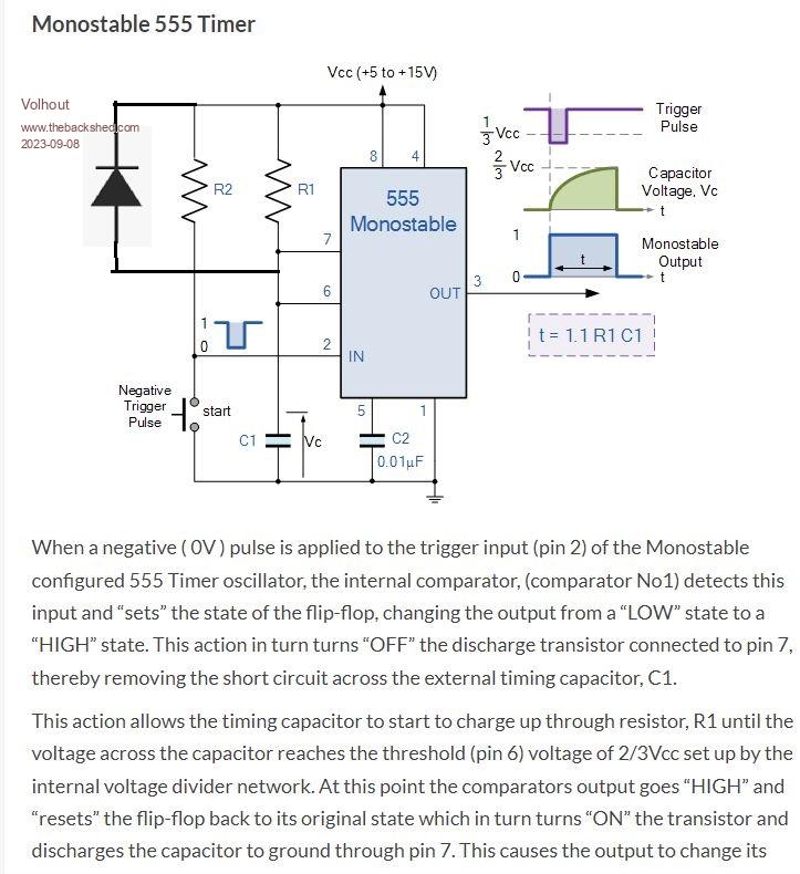To overcome this I have assembled a 555 astable multivibrator with a negative pulse when it times out. Time out is adjustable between ±0.5s and 80s. The low pulse is ±15ms.