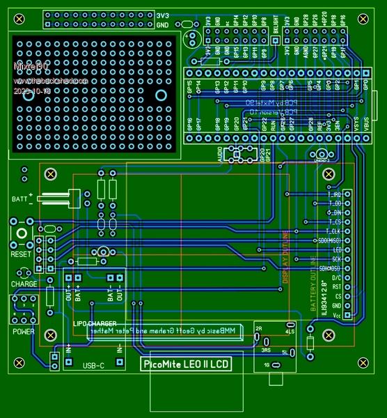 This has a bit of a history. Tom has commented that my PicoMite Backpack was one of the inspirations for his Game*Mite design. I was looking at the Game*Mite the other day (I've been programming on it) and wondered what it would be like as a multi-purpose testbed. Then I realised that, up until now, I haven't done anything quite like that. Stan has been looking at alternatives to PCBs and he uses the ILI9341 so I figured that would be a good approach so...