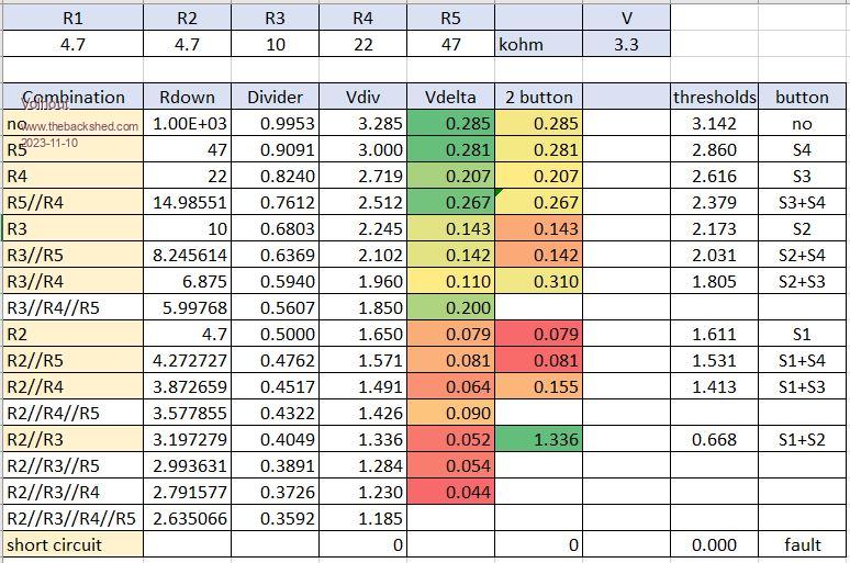 This will give you 80mV minimum resolution for 2 key press detect (change R1 to 4.7k). This is in the "2-button" column in the red fields (0.080 = 0.080 volt = 80 milivolt)