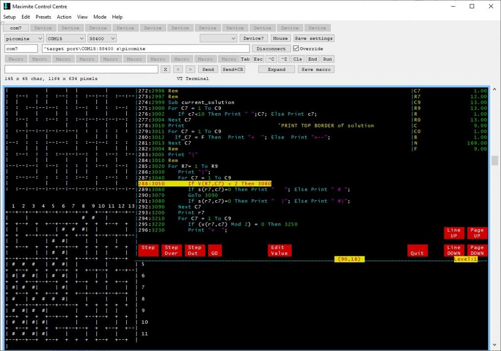 Below is a screen shot of the modified Amazing.bas program running with MMDebug in control.   You can see one of the modifications where this version of Amazing.bas is displaying the solution to the maze after the actual maze is printed.   During the print out of the solution I pressed Ctrl-D and MMDebug woke up and took control.