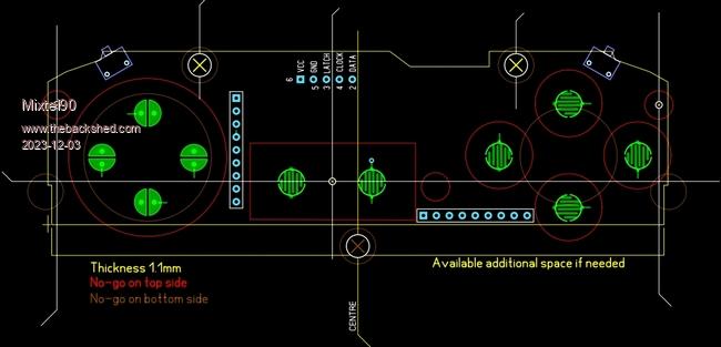 The case has plenty of mouldings in it to give support to the thin PCB under the action of high pressure fingers! There are no-go areas on both the bottom of the board, where you'd expect them, but also round every set of switch contacts. ![]() It looks like it might just be possible to do a through-hole design if components are mounted on the bottom side of the board. There is more height there (between the two big tubes in the bottom moulding). SMD on the other side might be more of a challenge. This is the basic PCB that we can work from: I've put the trigger switches on and tentative positions for two 8-way commoned resistor packs. I've done the drawing SL6 rather than CAD as that's where I'm going to need it and I can't directly convert between them. It's a pity because using CAD for this would have been easier. Edited 2023-12-03 19:33 by Mixtel90 Mick Zilog Inside! nascom.info for Nascom & Gemini Preliminary MMBasic docs & my PCB designs |