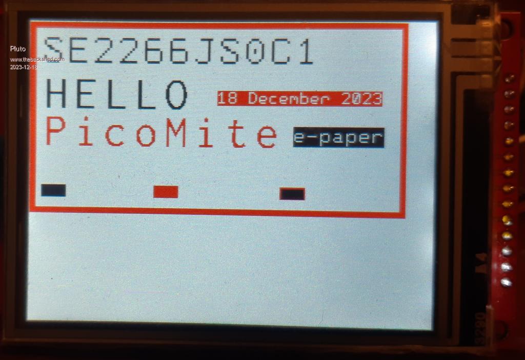 I recently found an e-paper display that I would like to test. The display is PervasiveDisplays E2266JS0C1 2.66".296×152. Black,white and red. I believe it is the same as Waveshare is using in 2.66". Hence I have some hope that Peter' 2018 code would be a good starting point. Loading matherp's old e-paper drivers...but I immediately run into problems. OPTION LCDPANEL USER is not working...Error : Invalid display type I cannot find OPTION LCDPANEL USER in the PicoMite's or other mite's manuals. Suppose this is not a valid command anymore? Tried to search the manuals for guidance, but unfortunately without success. (PicoMite MMBasic Version 5.08.00b4. No options selected yet.) Any suggestions for getting forward with testing? Pluto |