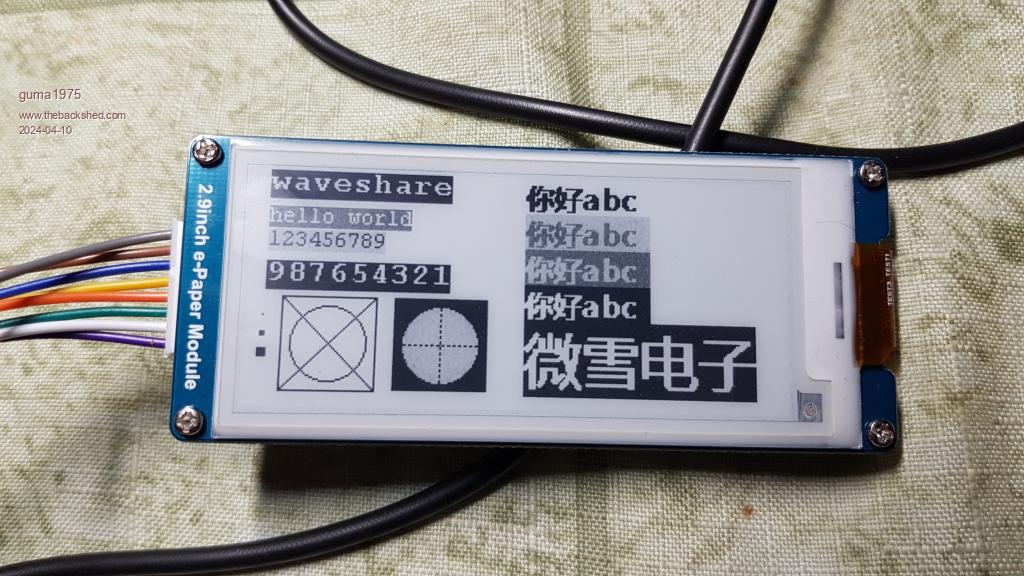 Hello and welcome. I tried to connect a 2.9-inch waveshare and try the driver as in the first post... But it turned out that I had version v2 296x128 or 128x296. Is there any possibility for v2 to work? When I looked at v2, there are a lot of differences, but since I'm new to this wonderful Picomite software, I'm slowly giving up... Can you tell me where and what to change? From what I've gathered, the initialization is probably different and due to the handling of gray levels, it's very complicated for me... I'm trying to understand what this lut_full is, but I'm probably rusty because I'm from 1975... hihi... Regards and warmest regards thank you in advance for any help... PS... Sorry for my English, but it's because of the translator.... From what I saw on the 1054z oscilloscope, the pins work correctly.... Here is a photo of this display from the back. ![]() From the front it looks the same as in the first post. I thought it was damaged but I managed to find a ready-made uf2 demo for pico and upload it from github and it works... But luckily, I don't know C, and for me, basic is still manageable in play at this age... I am attaching photos of the finished uf2 from github... ![]() ![]() ![]() Thank you all for such a beautiful gift in the form of picomite and for your contribution to this project. For me it's something beautiful - you can touch BASIC with such powerful functions. Best regards again. rubber1975. |