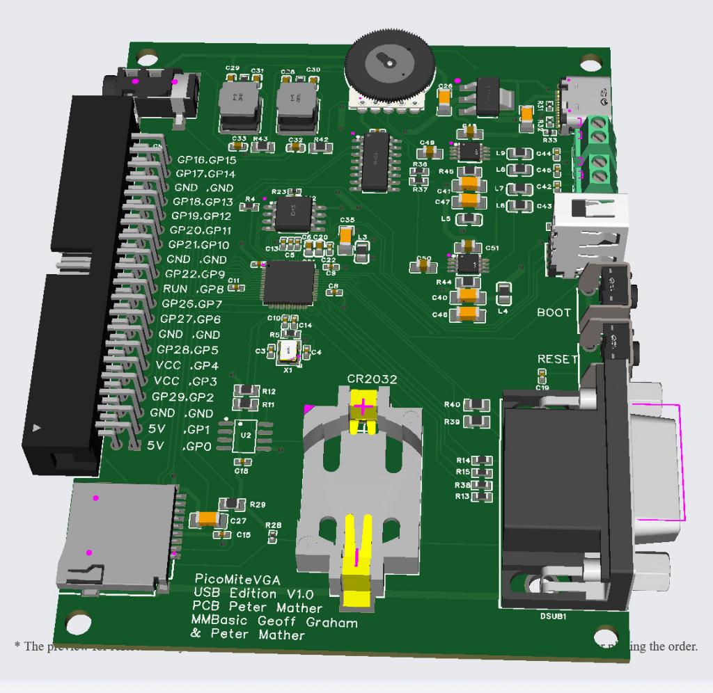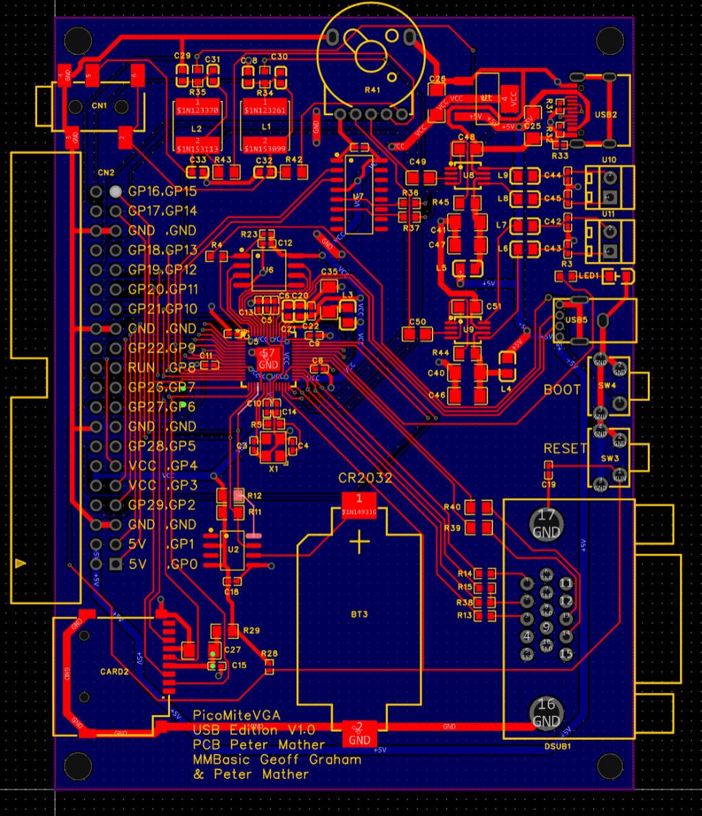 Hi Peter, If you plan to make this a CMM1.5 , using the RP2040 chip, then maybe reserve pins to do RGB 2:2:2 palette mode. Volhout PicomiteVGA PETSCII ROBOTS |