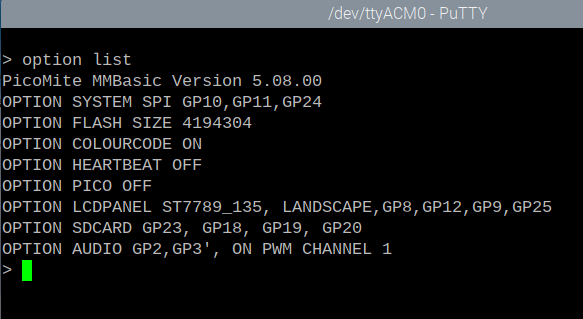 Hi Peter, Can I suggest adding OPTION RESET LIST command (or similar) to list all the available board configurations. Nice red Game*Mite, yours? Best wishes, Tom MMBasic for Linux, Game*Mite, CMM2 Welcome Tape, Creaky old text adventures |