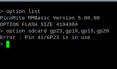 Hi All; I have a waveshare-geek and loaded 5.9 RC1 to try the OPTION RESET RP2040-GEEK command. The 1st thing was the lack of OPTION SDCARD and a difference in the display GPIOs causing the display to flash on and off. The GUI TEST LCDPANEL did not show anything and gave no errors. Then comes the weird part after I did an OPTION RESET and tried to configure the SDCARD, so I could do a OPTION DISK LOAD, after hitting enter it gave me a message that pin 41/23 was all ready in use. Of course it did that was used up in the display configuration of OPTION RESET RP2040-GEEK, but why was it still there? (Sorry forgot the screen shot). I had this thing working completely under 5.8 ; ![]() My thinking was to go back to 5.8 and thats when I had a real problem! I first used Clear_flash.uf2 then loaded 5.8.00. I went to configure the sdcard and up came the same message as in 5.9; ![]() I hope this does not mean my Geek is now pooched. If you need more information please ask. Hans ... |