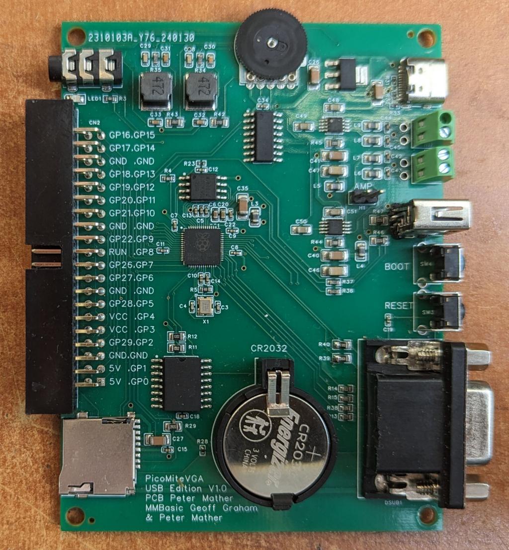Firmware V5.09.00 release candidate RC1 is now available for download from https://geoffg.net/Downloads/picomite/PicoMite_Beta.zip This release includes some major internal changes including the move to 16-bit command tokens. The source has been updated on GitHub. There are 5 firmware variants: PicoMite - base version PicoMiteVGA - base VGA version WebMite - base version for Pico-W PicoMiteUSB - Version with serial console support on GP8/GP9 and HID device support PicoMiteVGAUSB VGA version with serial console support on GP8/GP9 and HID device support HID device support includes up to 4 of USB keyboard, USB mouse, PS3 controller, PS4 controller and SNES gamepad directly connected for one device and via a 4-port hub for more than one device. In addition this release includes LCD console support for any connected TFT display. Various optimisations have been included to overcome the speed constraints of SPI displays. The release also includes support for 16-bit parallel connected displays for the ultimate in display speed. A number of bugs have been corrected In addition the release includes support for fast configuration of a number of boards using the OPTION RESET board command. More will be added during the release candidate process. No longer will you have to keep visiting the various sources to work out how to configure a board. Where applicable the configuration will include touch calibration but as this may vary between displays you may need to re-calibrate once the firmware is configured. Please read the development threads here and here for mere details on the contents of the release This release will delete all current options and in some cases the A: drive OPTION RESET CMM1.5 ![]() ![]() OPTION RESET Game*Mite ![]() OPTION RESET PicoMiteVGA V1.0 ![]() OPTION RESET PicoMiteVGA V1.1 ![]() OPTION RESET VGA Design 1 ![]() OPTION RESET VGA Design 2 ![]() OPTION RESET PICO BACKPACK ![]() OPTION RESET RP2040-GEEK ![]() OPTION RESET RP2040-LCD-0.96 ![]() OPTION RESET RP2040-LCD-1.28 ![]() OPTION RESET Pico-ResTouch-LCD-3.5 ![]() OPTION RESET Pico-ResTouch-LCD-2.8 ![]() Edited 2024-03-24 20:37 by matherp |