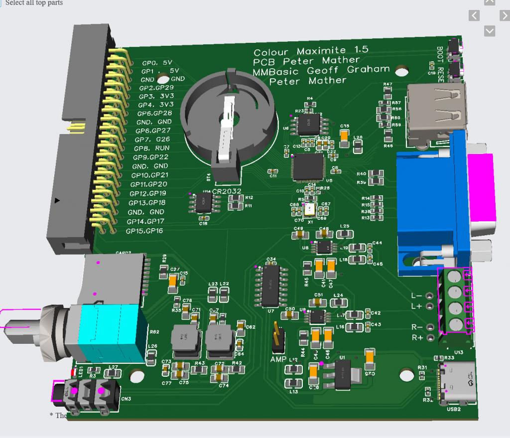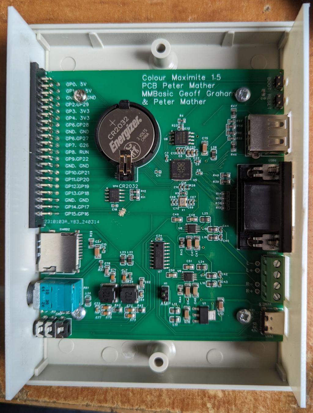 The CMM1.5 is a platform for running the PicoMiteVGAUSB software. Attached are all the design files to allow anyone to build this. The box is the MULTICOMP MCRM2015S. Price for 5 boards fully complete and ready to run from JLC is £80.20 + shipping and any country dependent taxes.