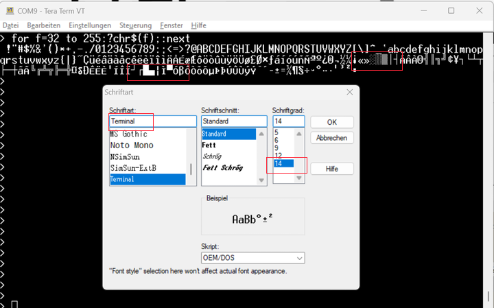 On teraterm I selected "Terminal" font, and now it looks the same.Volhout