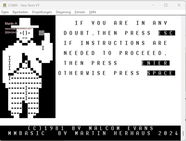 Here is the cleaned multi-platform version 3dMonsterm1.zip Supported systems: PicoMiteVGA Game*Mite MMBasic 4 Windows ----------- for a pure PicoMite continue to use the VT Terminal version from the beginning of this post Game*Mite Controlls are included: A/Start = Enter instructions B/Down = Space Select = Escape direction buttons Navigateion have a nice Weekend Martin Edited 2024-04-28 03:24 by Martin H. 'no comment |