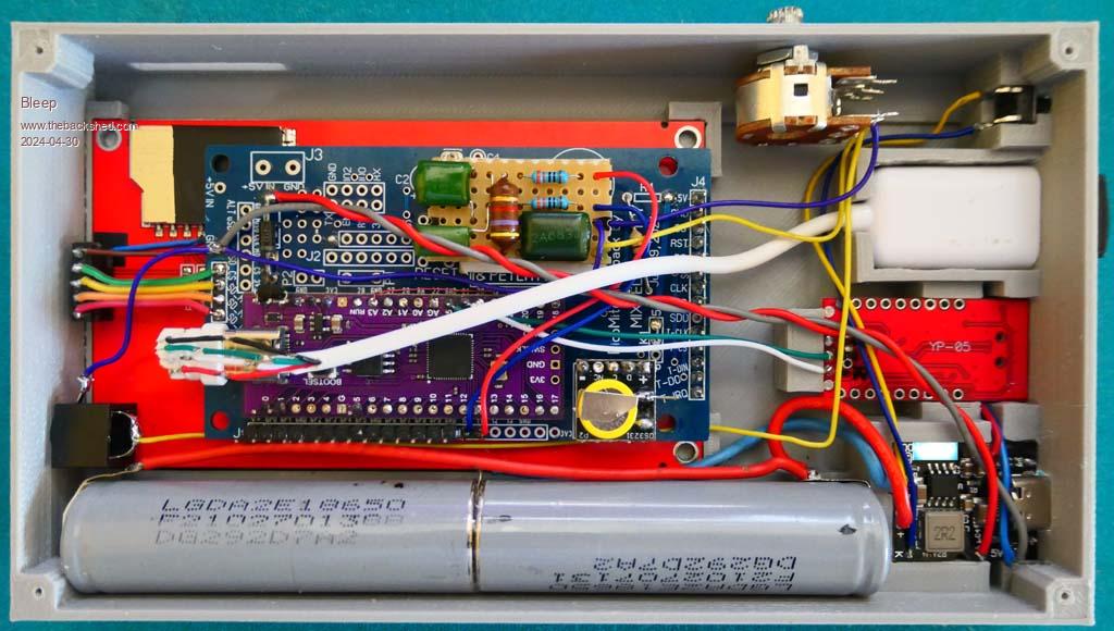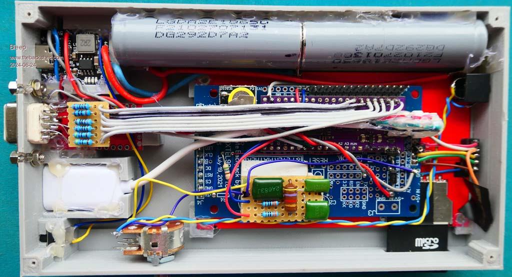 ![]() ![]() I wanted to build something that would be self contained and fully portable, this is what I came up with. It uses a 4" ILI9488 LCD screen, 480x320 with touch, from AliExpress It has:- USB obviously. Mono sound through a jack plug, with volume, could easily be stereo. Serial to USB. SD card. RTC. All GPIO from GP0 to GP9 are free, coming out to a connector J1 along the bottom edge. All the A/D inputs GP26 to GP28, coming out on connector J2. Can be used as a battery bank when powered on to charge whatever... It uses:- A Chinese Pico, because I wanted the extra flash. One of Mixtel90 backpack boards, mainly as a carrier and for connections to the screen, RTC and SD card. A Lithium battery controller/charger/booster with on-off facility from Ebay A serial to USB converter from Ebay A RTC from Ebay A strip board with Volhouts Audio filter, into which both audio outputs are fed, can easily be made stereo, then on to the 1K potentiometer and output from a jack plug. Other sundry components were 2x Lithium batteries salvaged from a broken LapTop power pack 2.2AHr(measured) each, jack plug, 1K pot, momentary push switch and a box, which I designed up in FreeCAD, unfortunately my printer isn't great, but it has done the job, one slight hiccup was I designed it to have a 1.5mm recess in the back, into which the back plate should have dropped, for a currently unknown reason the printer stopped at exactly 1.5mm from finishing, so the back plate currently doesn't really fit, it sort of sits, but I will at some point make a larger back plate to properly cover the back. (the back plate should only take 30mins, the whole box took 7hrs. For the initial setup and testing everything is only friction fitted, once I'm confident it's all good, I'll hot glue everything, especially the batteries! To operate you press the momentary button once and it all powers up, press twice and it powers down, if you connect to a powered external USB plug, the unit switches over to charging the batteries, as well as powering the unit, only caveat is once you are charging, if you remove the USB cable the unit will shut down briefly and then power back up, better to just leave it charging, then when you want to disconnect, press and hold the button while unplugging the power, it will then stay off, inserting USB power is ok, the unit continues running fine, or powers up if it was off. Battery duration will be about 10 hours, full brightness screen, cpu at 420MHz, or about 20 hours, 50% brightness and 126MHz, or any combination in-between! If you want music, I've experimented and have found compressing to a WAV file, using ADPCM @ 22kHz sample rate works acceptably, so nothing above about 10kHz, not exactly HiFi, but quite acceptable, especially for my ears. The file size is slightly bigger than a MP3 for the same track, so 4.41MB for MP3 and 6.15MB for ADPCM WAV, as opposed to 24.3MB for PCM lossless WAV. The blue light you can see, is infact a 4 bar LED, which gives approximate charge state. More gratuitous pictures:- ![]() ![]() ![]() ![]() |