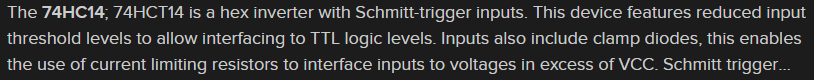 note from the datasheet:"Input Clamp Current ... ±20 mA" so 1K would be fine, but to save a bit of juice I'd go higher. it's a CMOS input so not terribly low impedance beyond the clamp anyway, we are only sparing the diodes. Whereas Harm's reply above is perfectly valid, in the interests of reducing the component count I would use a 4K7 in series with the inputs. Excess voltage into each input (assuming 5V with Vcc=3.3) would be 1.7v, under 4K7 is around 360uA so even if all six inverters are used, it will dump just 2mA into Vcc across the whole chip. I wouldn't lose sleep over that. I would use whatever resistor 2K2 - 10K I had most of ![]() Edited 2024-05-16 22:09 by CaptainBoing |