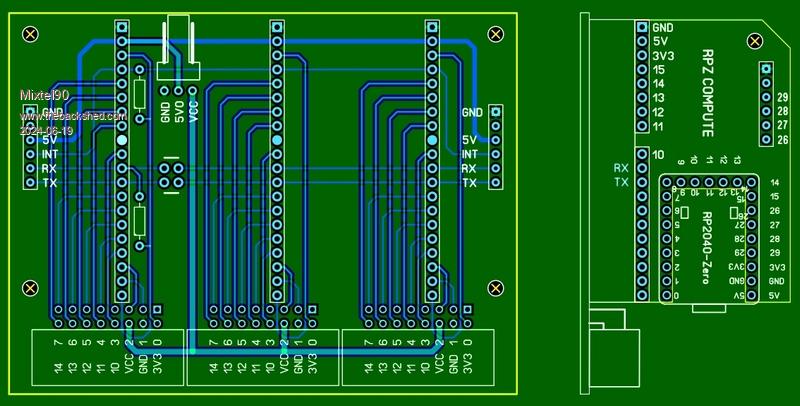 Here's my idea for a simple multi-processor controller using the RPZ compute module. Is it the cheapest expandable PLC? :) The LH socket can be configured for a normal expansion module or for the master. There can only be one master on the system and it has to be the leftmost one. The board carrying the master has the two resistors fitted and the four pads linked as a crossover. There is no expansion to the LHS for this board. Expansion boards don't have the resistors and the pads are linked straight across. Each module is powered from the 5V rail and provides its own 3V3 for its IO. A VCC pin allows an external supply to be available to the outputs. It could be used to power, say, more powerful LEDs than the IO pins can supply. It's separate from the 5V rail as it could be 12V for example. Each board has its own VCC. You could run one at 12V and another at 24V if you wish. :) The 5V supply is common to all the modules so any of them, or the rear connector, can be used for the supply. IO connections are via horizontal IDC connectors. There is a common INT line on GP15 with a pullup resistor. This is intended to be an interrupt or reset signal line - it depends on the application. Mick Zilog Inside! nascom.info for Nascom & Gemini Preliminary MMBasic docs & my PCB designs |