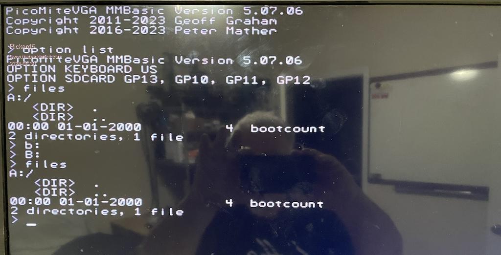 The Pico firmware creates Drive A: in the on-board flash chip so as noted above the SD card is B:. Here is PicoMite V5.09.00RC5 firmware. PicoMite_Beta (1).zip Edit. At the command prompt type B: <enter> Edited 2024-06-28 16:18 by phil99 |