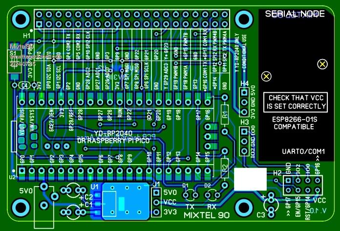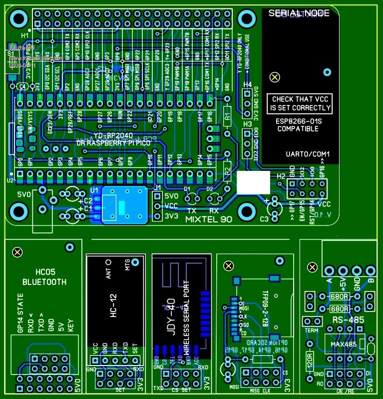 This isn't specifically a MMBasic platform, but it could be used as such. It could just as easily run python. Basically it's a Pico (or clone) attached to a ESP8266-01S socket. The GPIO port can get it's 3V3 supply from the Pico or from an on-board regulator, which can also power the ESP socket. I called it a Serial Node because I think its main use would be as a distributed IO system, using wired or wireless networking.