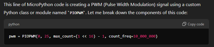 This code creates a PWM signal on GPIO pin 25 using the PIO (Programmable Input/Output) feature. The signal is generated by a 16-bit counter that counts up to 65535, and the counting is done at a frequency of 10 MHz. The PIOPWM class likely abstracts the low-level details of generating PWM signals using the PIO state machines available in some microcontrollers like the RP2040 (found in the Raspberry Pi Pico).