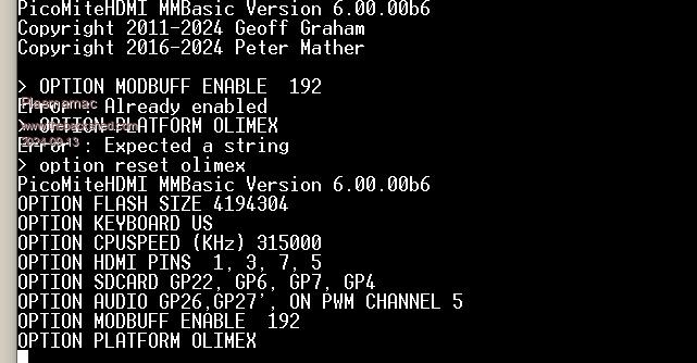 > option list PicoMiteHDMI MMBasic Version 6.00.00b6 OPTION AUTORUN ON OPTION FLASH SIZE 4194304 OPTION KEYBOARD UK OPTION CPUSPEED (KHz) 315000 OPTION DISPLAY 24, 80 OPTION HDMI PINS 1, 3, 7, 5 OPTION SDCARD GP22, GP6, GP7, GP4 OPTION AUDIO GP26,GP27', ON PWM CHANNEL 5 OPTION MODBUFF ENABLE 192 OPTION PLATFORM OLIMEX > it's OPTION PLATFORM OLIMEX > made it work 4 me |