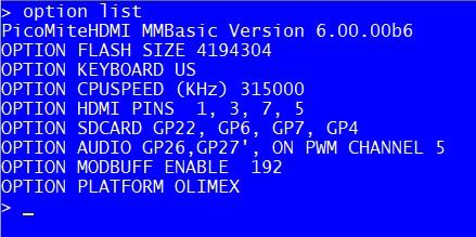 Currently I am trying to configure a standard RPi Pico 2 which has the HDMI b6 firmware installed (non USB). I used OPTION RESET OLIMEX and the following options have been automatically set: