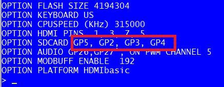 Note the 372000 value in the above error message which I had just previously tried. So, now I'm thinking it is because PLATFORM is set to OLIMEX and perhaps it should be set to HDMIBasic instead. I typed OPTION RESET HDMIBASIC holding out hope it would let me set the cpuspeed value needed for 720P but I noticed the SD pins changed (shown in next image below) so decided to go back to OPTION RESET OLIMEX (hence SD pins now correct once again). [Peter: Note Platform shows 'HDMIbasic' with a lowercase 'b' - trivial, just letting you know]
