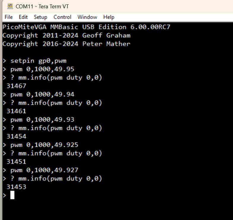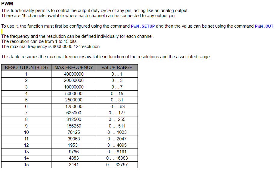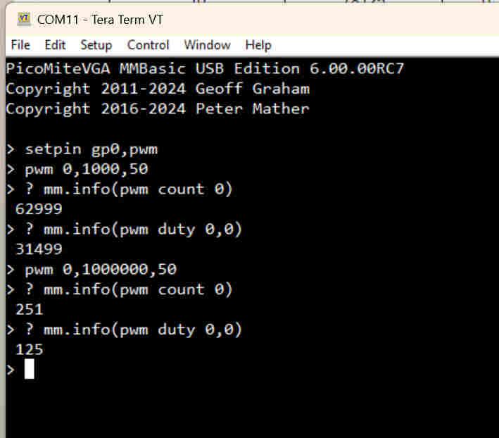 I don't know where this has come from. The number of bits depends on frequency. Above CPU speed / 65536 it will start to drop but below that it will be between 15 and 16 bits. ![]() You can see here that with a CPU frequency of 252MHz I have just under 8 bits of resolution at 1MHz but nearly 16 at 1KHz MM.INFO(PWM COUNT slice) gives the total counts being used to generate the frequency MM.INFO(PWM DUTY slice,channel) gives the counts at which the output transitions int wrap=(CPU_Speed*1000)/frequency; if(duty1>=0.0)high1=(int)((MMFLOAT)CPU_Speed/frequency*duty1*10.0); if(duty2>=0.0)high2=(int)((MMFLOAT)CPU_Speed/frequency*duty2*10.0); while(wrap>65535){ wrap>>=1; if(duty1>=0.0)high1>>=1; if(duty2>=0.0)high2>>=1; div<<=1; } if(div>256)error("Invalid frequency"); wrap--; if(high1)high1--; if(high2)high2--; Edited 2024-10-10 20:21 by matherp |