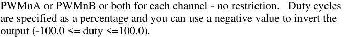 The PWM system uses hardware modules on the RP chip. It's not all handled in firmware. The RP has a number of "slices", 8 for the RP2040 and 12 for the RP2350. Each "slice" has a single clock divider, a single 16-bit counter and two outputs. Each "slice" can be enabled or disabled in software. Although all GPIO pins can be used for PWM they have to be in pairs, one pair for each "slice". Thus the RP2350B, which has 48 GPIO pins, has 12 "slices" and can have 24 simultaneous PWM pins arranged as 12 pairs. Mick Zilog Inside! nascom.info for Nascom & Gemini Preliminary MMBasic docs & my PCB designs |